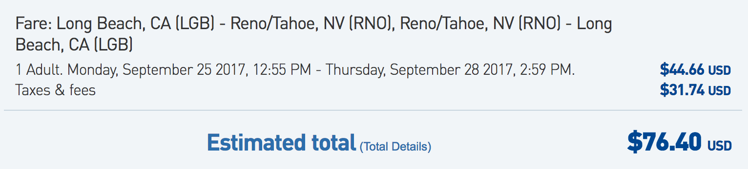 Long Beach (LGB) to Reno (RNO) for $76 round-trip in September: