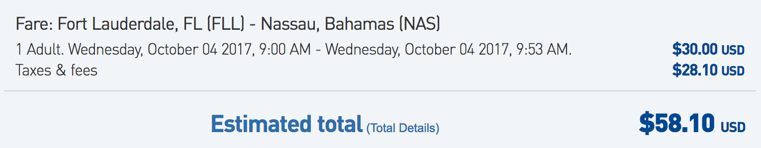 Fort Lauderdale (FLL) to Nassau, Bahamas (NAS) for $58 one-way in October: