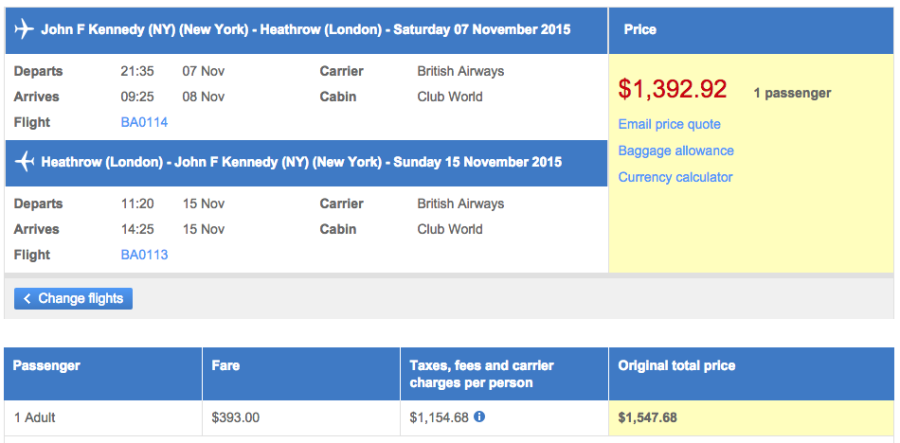 New York (JFK) to London (LHR) in business class on British Airways for $1,393: