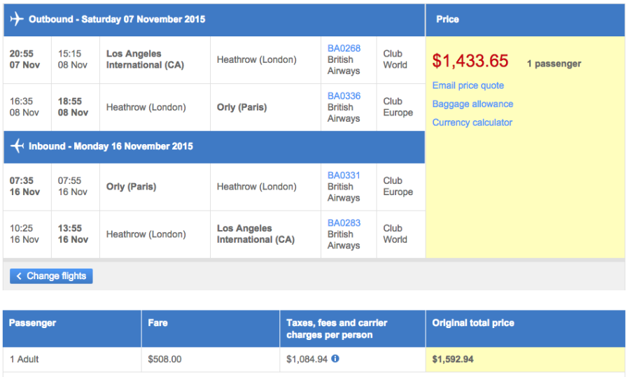 Los Angeles (LAX) to Paris (ORY) in business class on British Airways for $1,434: