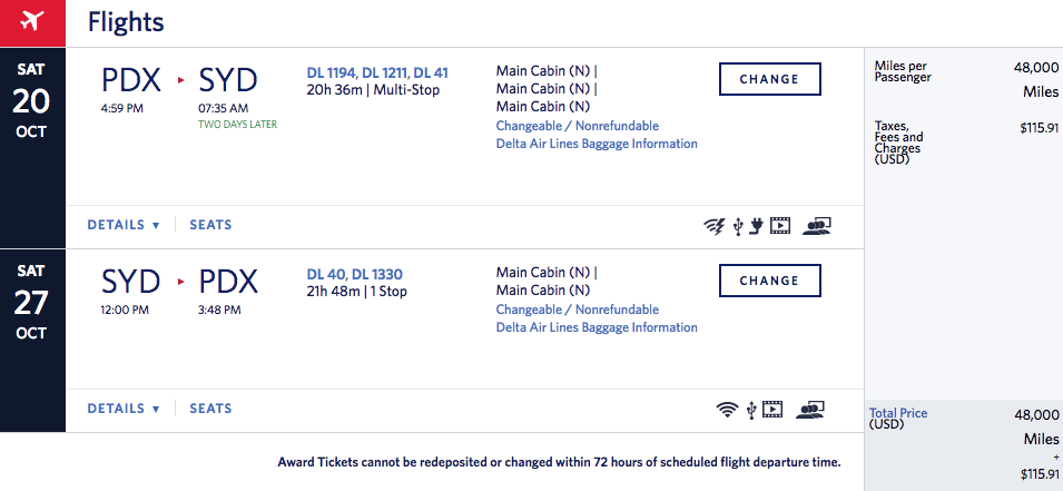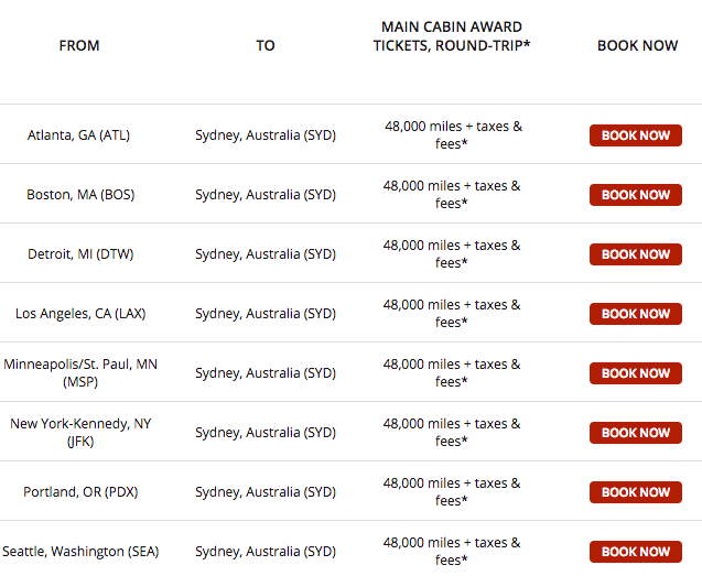 Every city that I plugged in seemed to have dates available at 48,000 miles round-trip, so just head over to Delta.com and enter your preferred departure city and destination as Sydney (SYD). For reference, both American and United charge 80,000 miles for a round-trip economy award between the US to Australia.