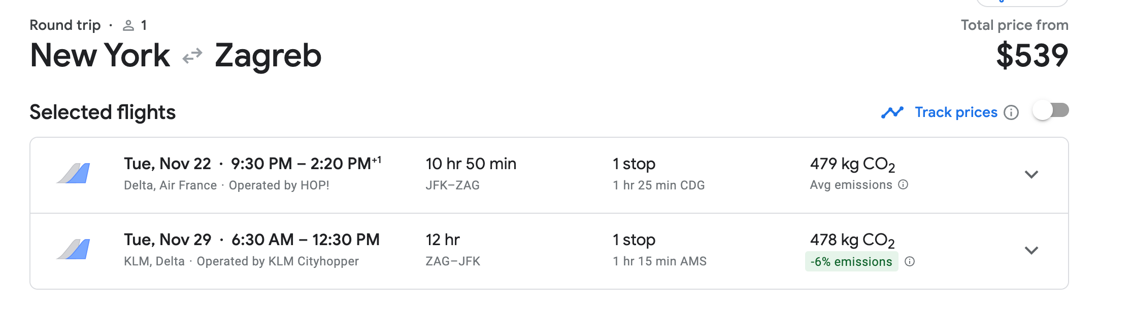 With an 85-minute layover in Paris, the flight departs JFK at 9:30 p.m. and arrives at Zagreb at 2:20 p.m. In Paris, the flight switches airlines from Delta to Air France.