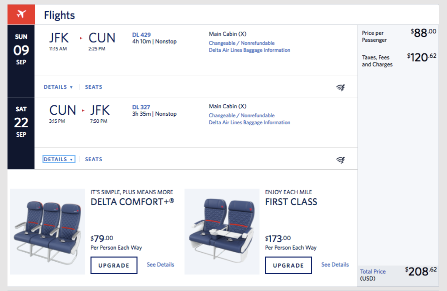 New York (JFK) to Cancun (CUN) in September for $209 round-trip on Delta in regular economy: