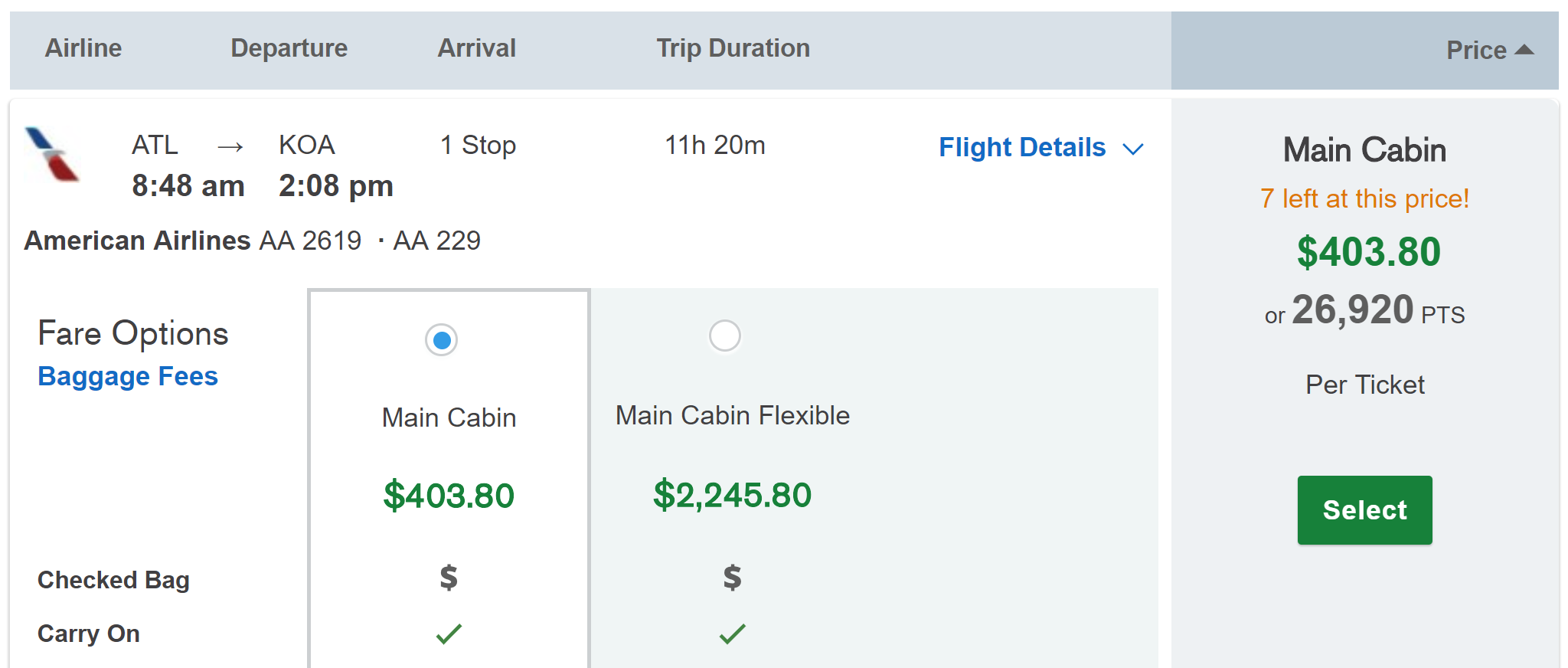 Atlanta (ATL) to Kona (KOA) on American for $404 round-trip or 26,920 UR points via Chase Ultimate Rewards portal: