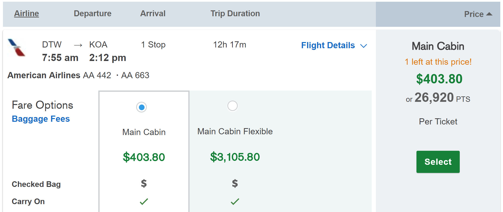 Detroit (DTW) to Kona (KOA) on American for $404 round-trip or 26,920 UR points via Chase Ultimate Rewards portal: