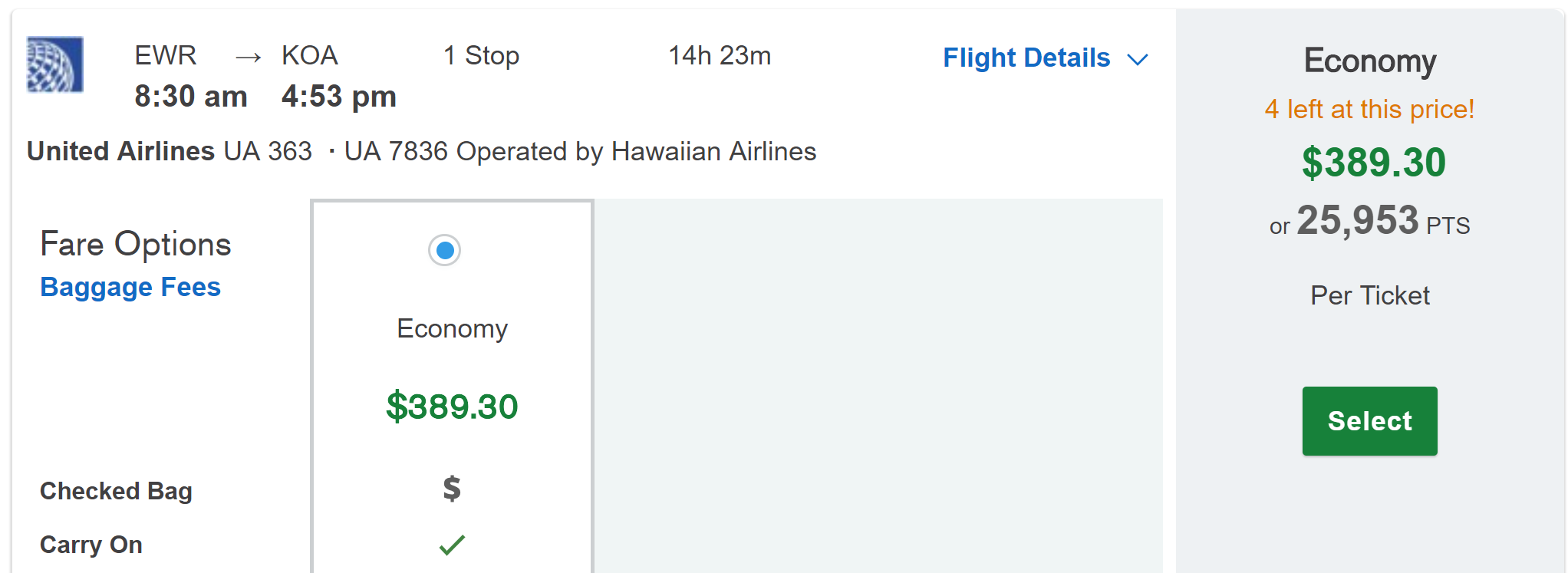 Newark (EWR) to Kona (KOA) on United for $389 round-trip or 25,893 UR points via Chase Ultimate Rewards portal: