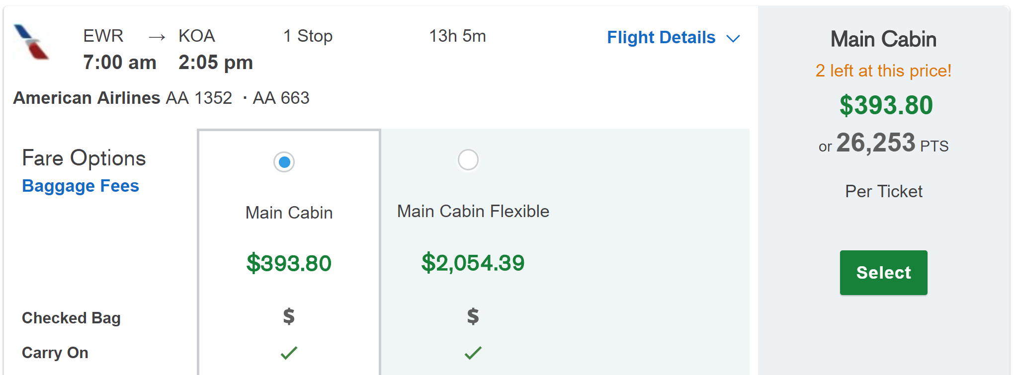 Newark (EWR) to Kona (KOA) on American for $394 round-trip or 26,253 UR points via Chase Ultimate Rewards portal: