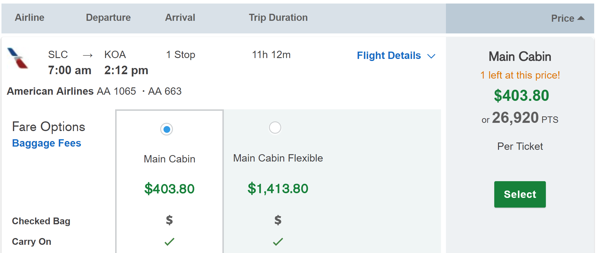 Salt Lake City (SLC) to Kona (KOA) on American for $404 round-trip or 26,920 UR points via Chase Ultimate Rewards portal: