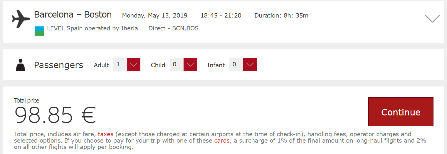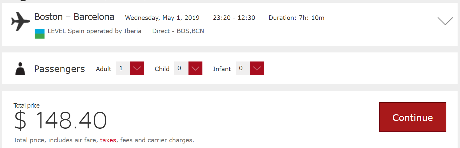 Boston (BOS) to Barcelona (BCN) for $262 round-trip nonstop on LEVEL ($148 outbound + $114 return):