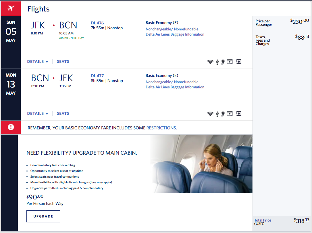New York's Kennedy (JFK) to Barcelona (BCN) for $318 round-trip nonstop on Delta:
