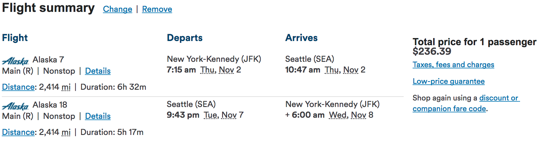 New York (JFK) to Seattle (SEA) for $236 round-trip on Alaska: