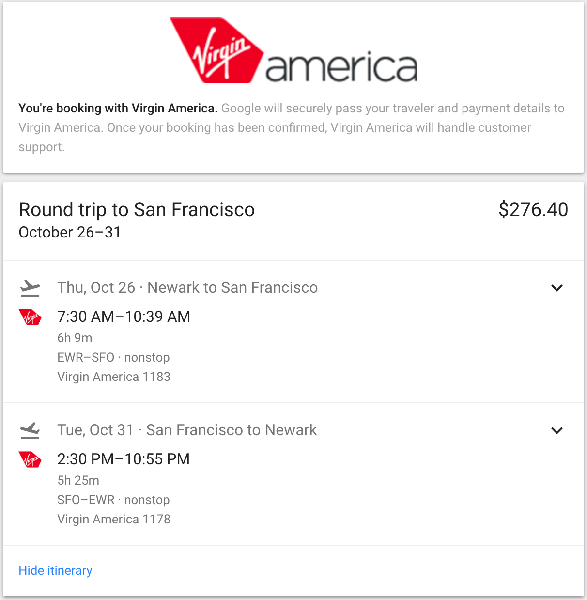 Newark (EWR) to San Francisco (SFO) for $276 round-trip on Virgin America: