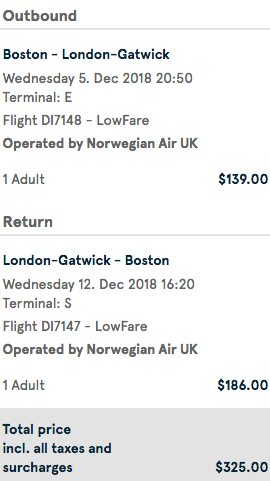Boston (BOS) to London (LGW) nonstop for $325 round-trip on Norwegian: