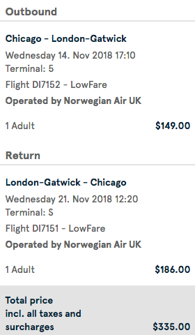 Chicago (ORD) to London (LGW) nonstop for $335 round-trip on Norwegian: