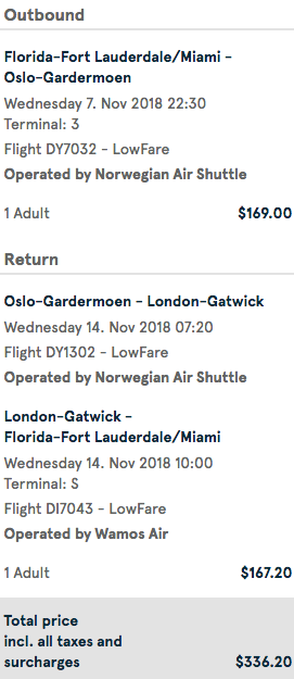 Fort Lauderdale (FLL) to Oslo (OSL) for $336 round-trip on Norwegian: