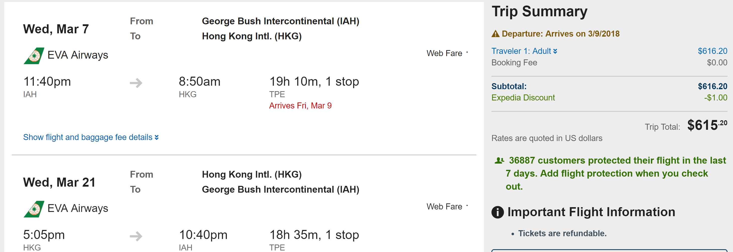 Houston (IAH) to Hong Kong (HKG) for $615 round-trip on EVA Air:
