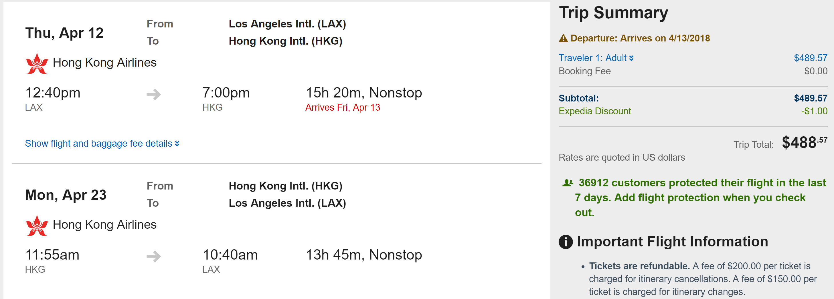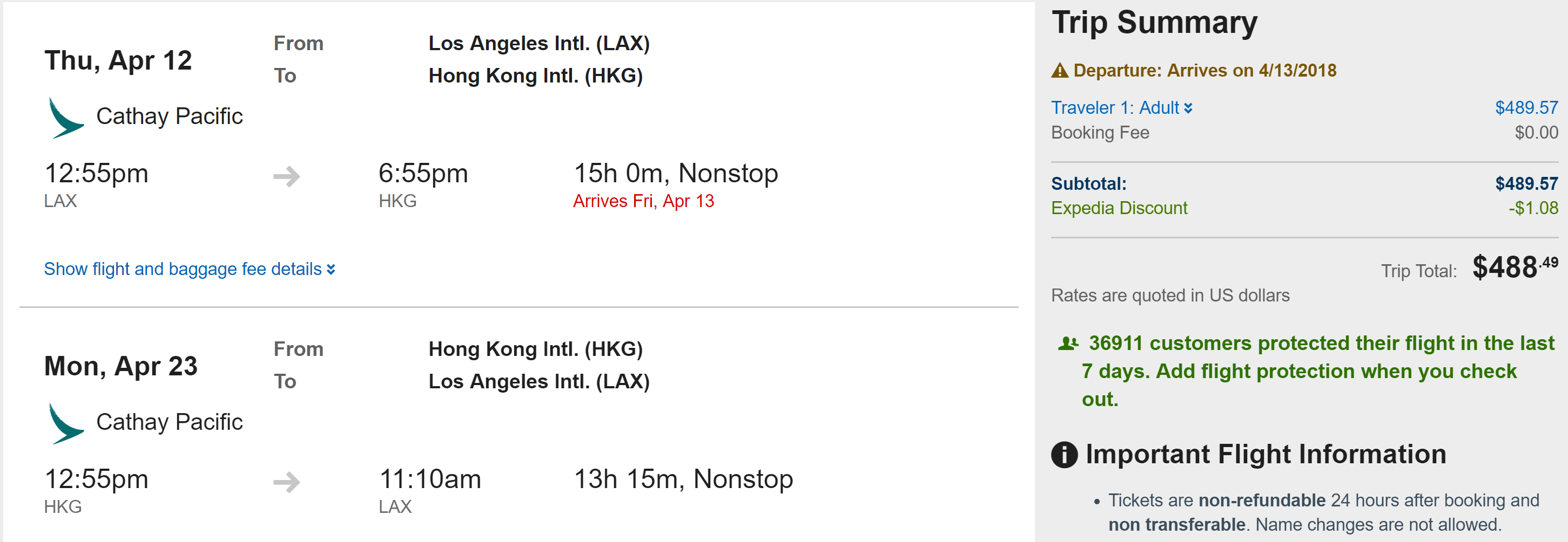 Los Angeles (LAX) to Hong Kong (HKG) for $489 round-trip nonstop on Cathay Pacific:
