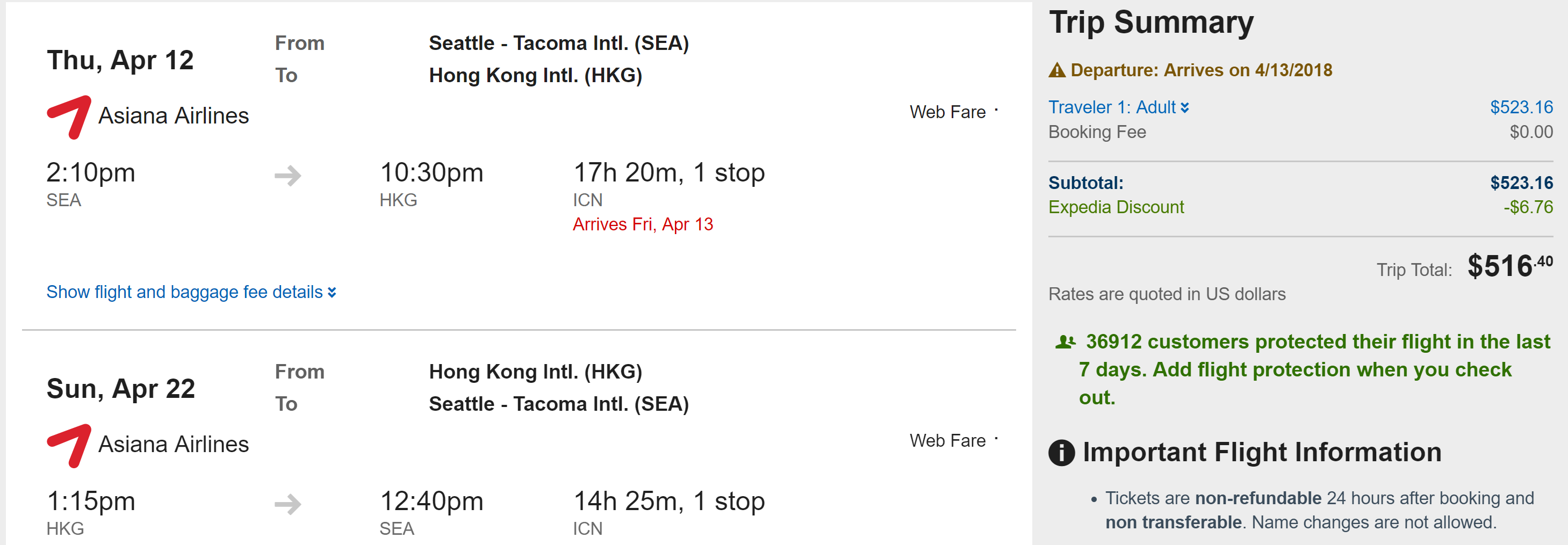 Seattle (SEA) to Hong Kong (HKG) for $516 round-trip on Asiana: