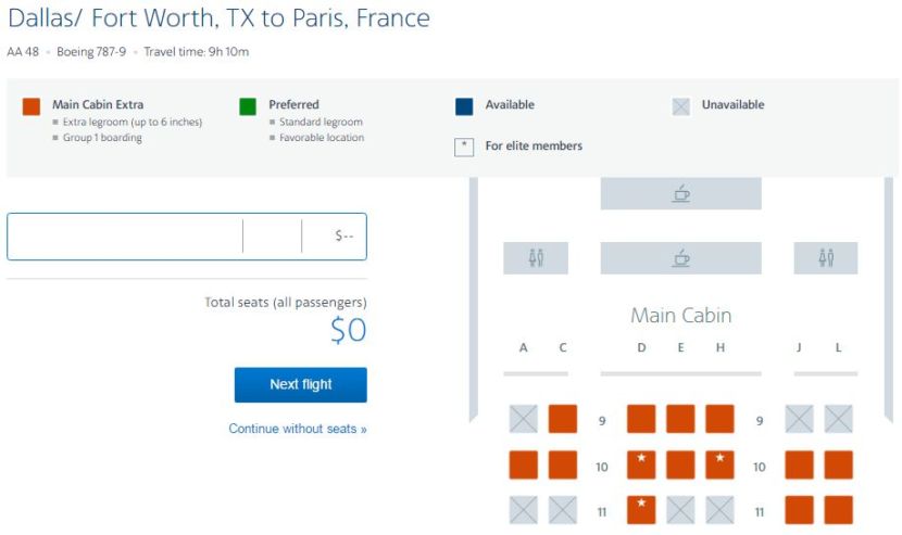 If you're able, you might want to route through Dallas (DFW) to fly to Paris (CDG), as these flights will be serviced by the brand new 787-9 Dreamliner. For now, Premium Economy seats are being sold as part of Main Cabin Extra, meaning American Airlines Platinums and Executive Platinum members can choose these seats for free at booking.