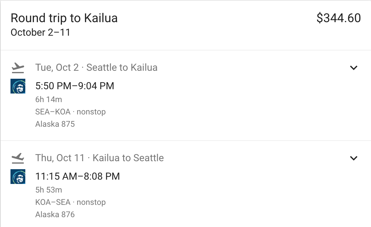 Seattle (SEA) to Kona (KOA) for $345 round-trip on Alaska: