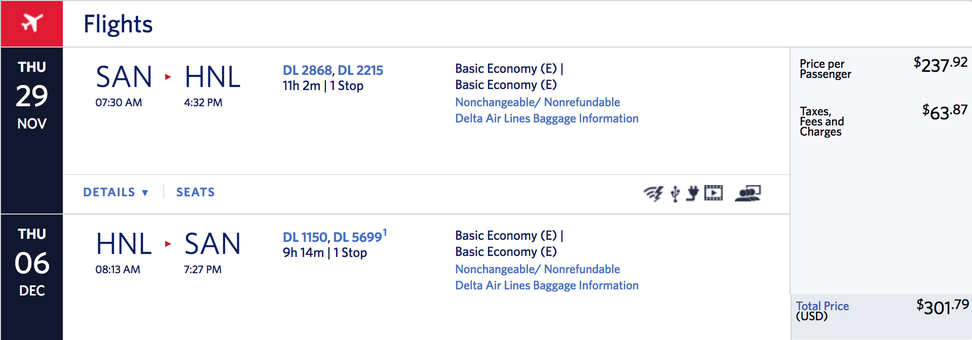 San Diego (SAN) to Honolulu (HNL) for $302 round-trip in Delta Basic Economy: