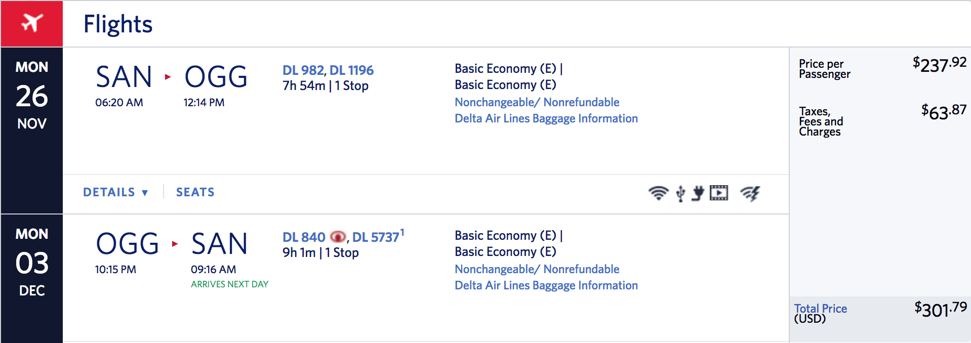 San Diego (SAN) to Maui (OGG) for $302 round-trip in Delta Basic Economy: