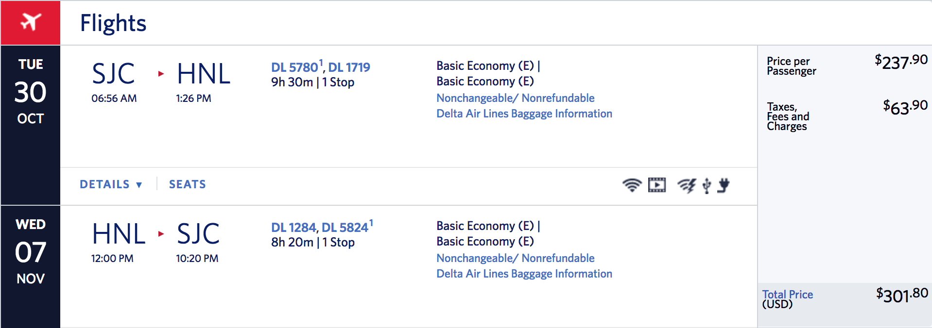 San Jose (SJC) to Honolulu (HNL) for $302 round-trip in Delta Basic Economy:
