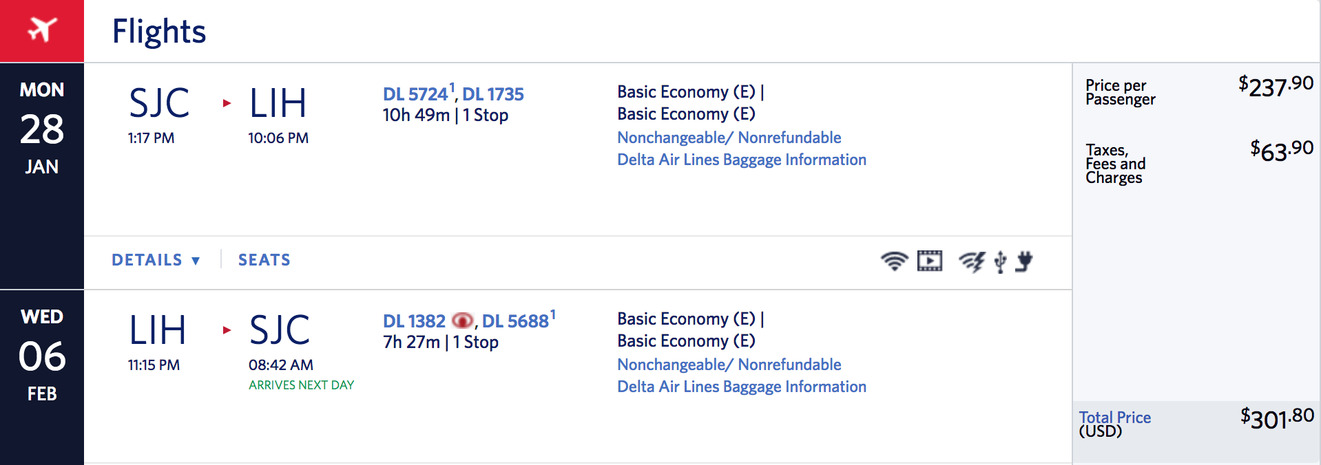 San Jose (SJC) to Kauai (LIH) for $302 round-trip in Delta Basic Economy: