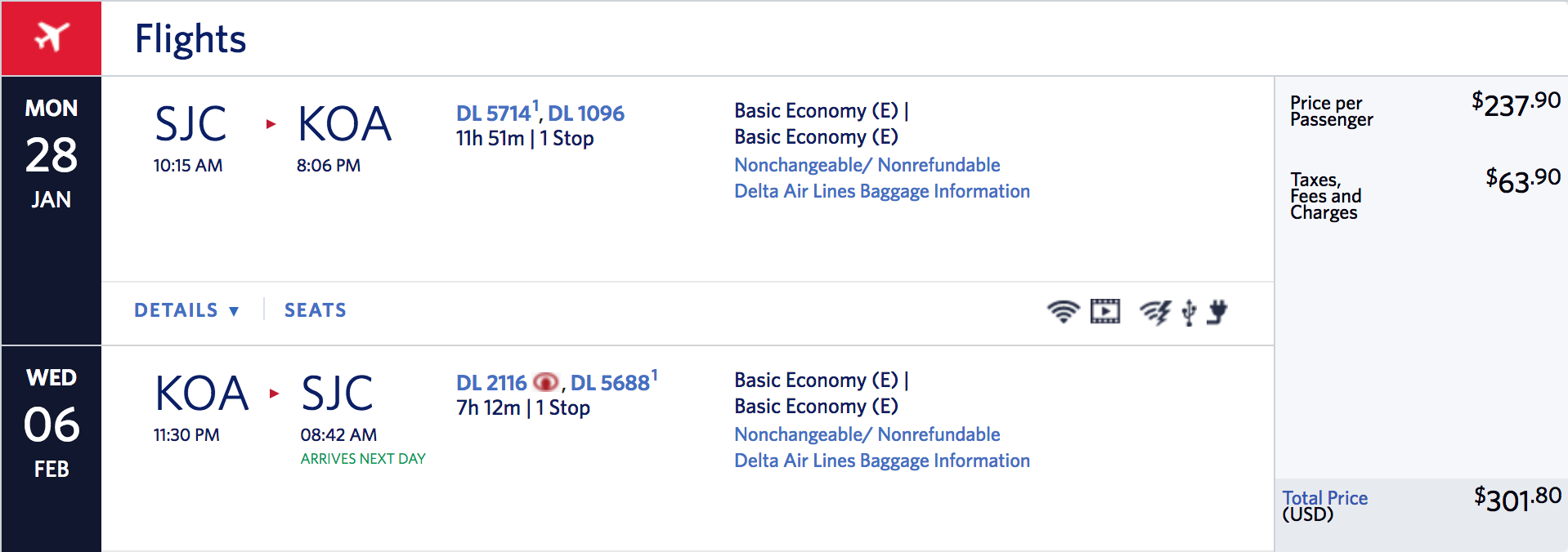 San Jose (SJC) to Kona (KOA) for $302 round-trip in Delta Basic Economy: