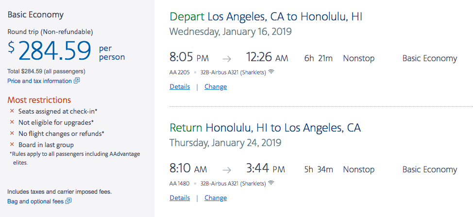Los Angeles (LAX) to Honolulu (HNL) for $285 round-trip nonstop in American Basic Economy: