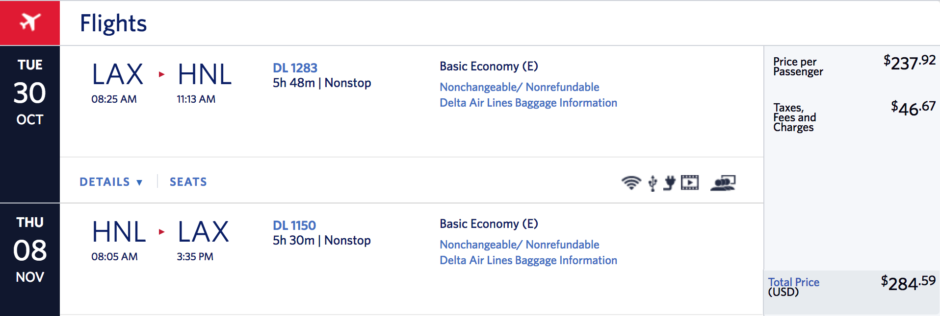 Los Angeles (LAX) to Honolulu (HNL) for $285 round-trip nonstop in Delta Basic Economy: