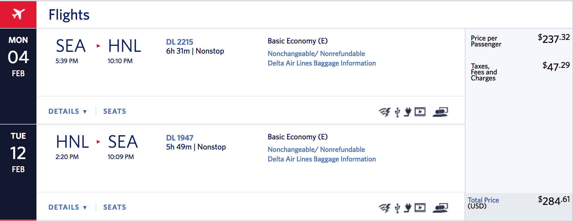 Seattle (SEA) to Honolulu (HNL) for $285 round-trip nonstop in Delta Basic Economy: