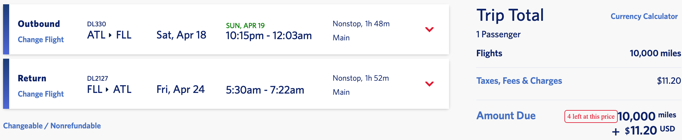 Atlanta (ATL) to Fort Lauderdale (FLL) for 10,000 miles + $11 in taxes and fees round-trip in economy: