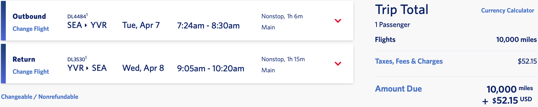 Seattle (SEA) to Vancouver (YVR) for 10,000 miles + $52 in taxes and fees round-trip in economy: