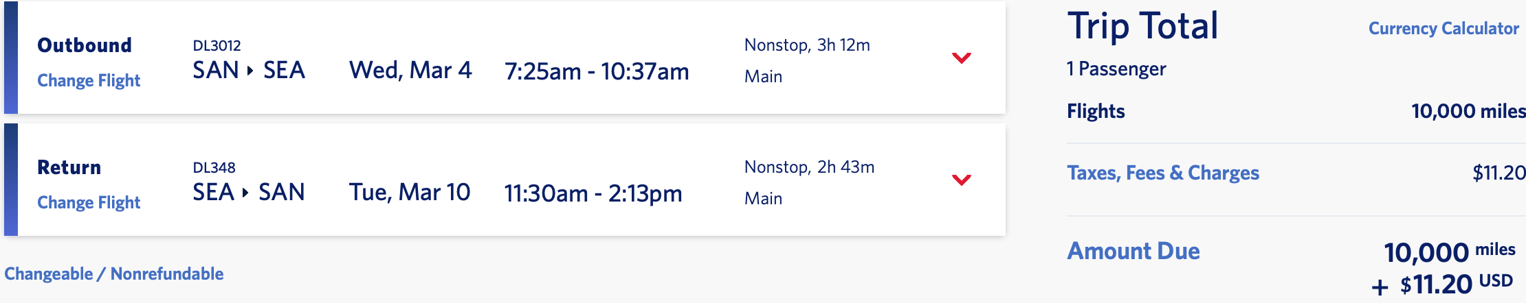 San Diego (SAN) to Seattle for 10,000 miles + $11 in taxes and fees round-trip nonstop in economy: