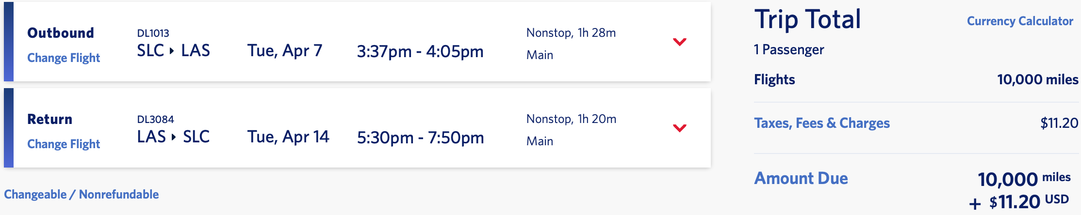 Salt Lake City (SLC) to Las Vegas (LAS) for 10,000 miles + $11 in taxes and fees round-trip nonstop in economy: