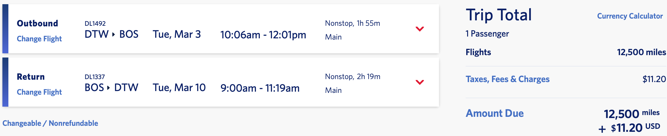 Detroit (DTW) to Boston (BOS) for 12,500 miles + $11 in taxes and fees round-trip nonstop in economy: