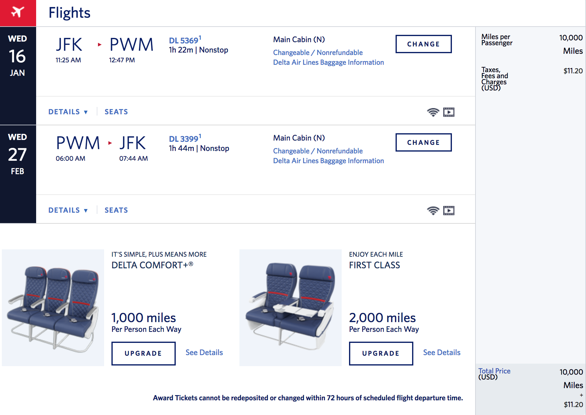 New York (JFK) to Portland (PWM) for 10,000 SkyMiles + $11 round-trip: