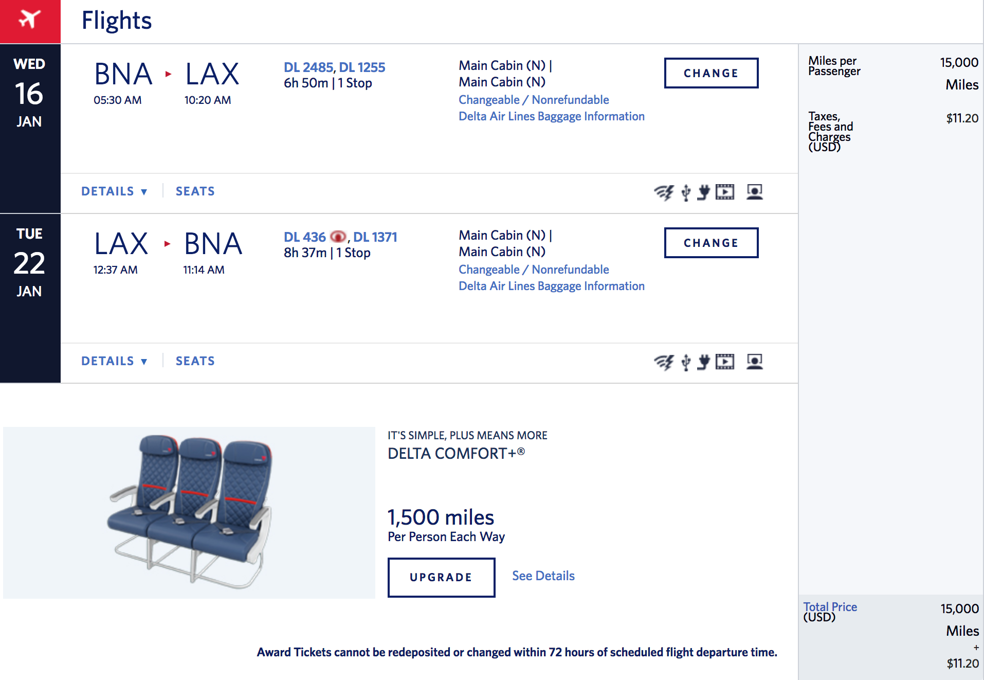 Nashville (BNA) to Los Angeles (LAX) for 15,000 SkyMiles + $11.20 round-trip: