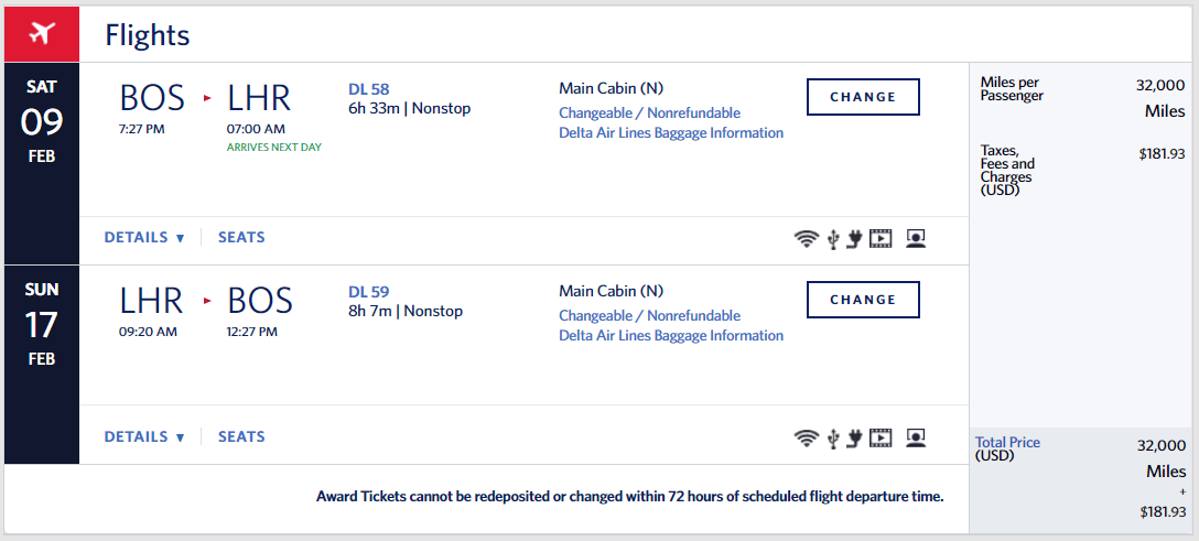 At current TPG valuations, 22,000 SkyMiles are worth just $264. Adding in taxes and fees starting at $42 and this is equivalent to scoring a $306 round-trip deal. What's especially valuable about these awards are that they book into Main Cabin and not basic economy. So you'll be able to check up to a 50 pound bag each way for free.