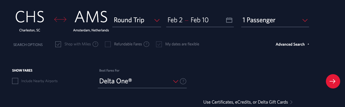 To begin your search, visit Delta's European sale link and be sure to select "Shop with Miles" and choose Delta One for the best fare type, as illustrated below.