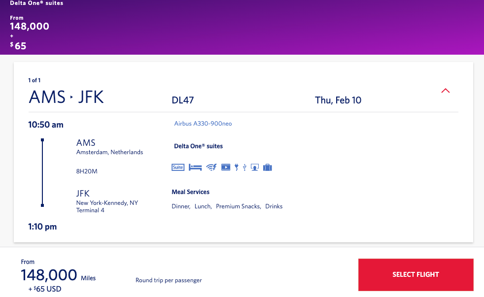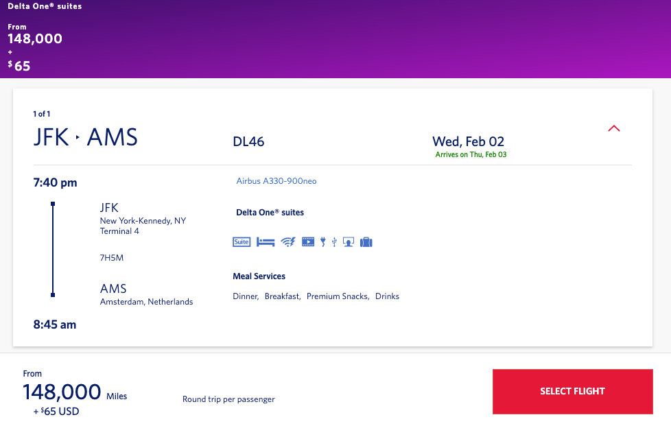 As you can see, this flight costs 148,000 miles total plus $65 in taxes and fees. Since this deal is for flights in Delta One, expect to enjoy all that business class has to offer, starting at the airport with complimentary Sky Club access and priority boarding. Onboard, enjoy full catering options and the ability to potentially sleep en route thanks to a lie-flat seat.