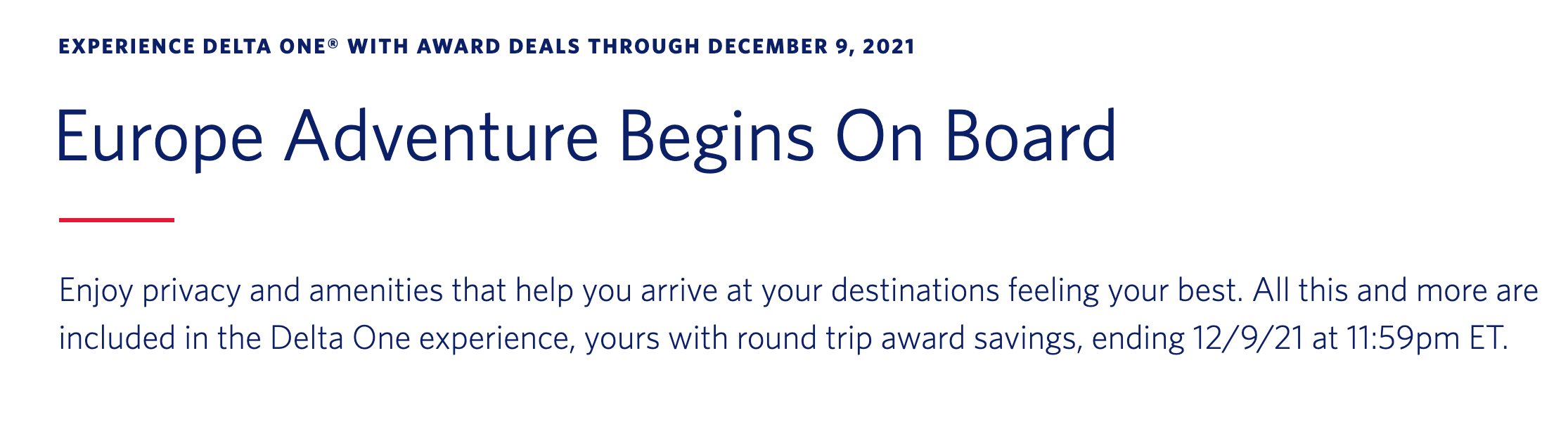 From Dec. 7-9, use SkyMiles to book Delta One award sale fares to various European destinations, including London, Amsterdam, Paris, Dublin and Madrid, for travel starting Jan. 10 through May 7, 2022.