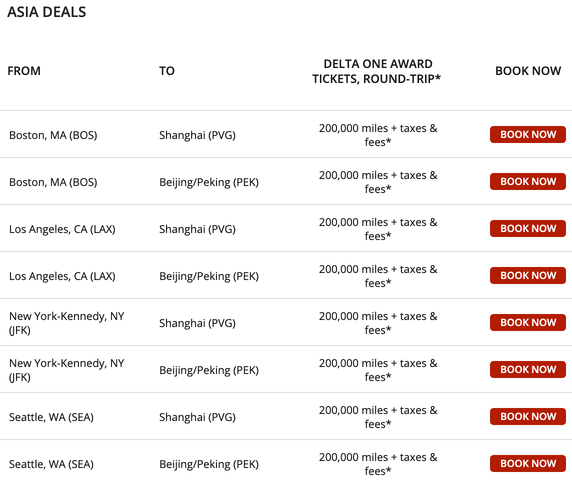 Seattle (SEA) to Beijing (PEK) for 200,000 miles and $36 round-trip nonstop in Delta One: