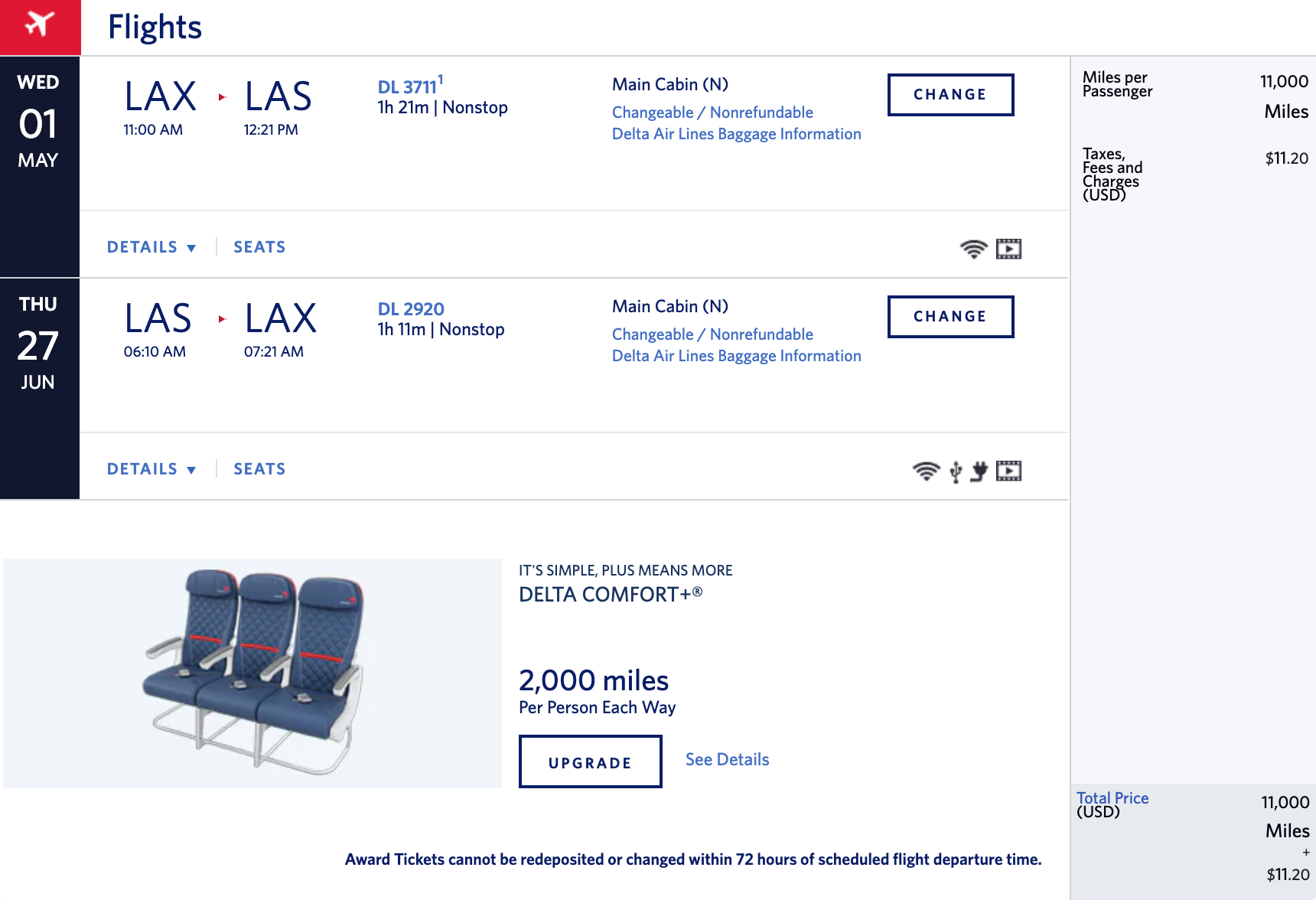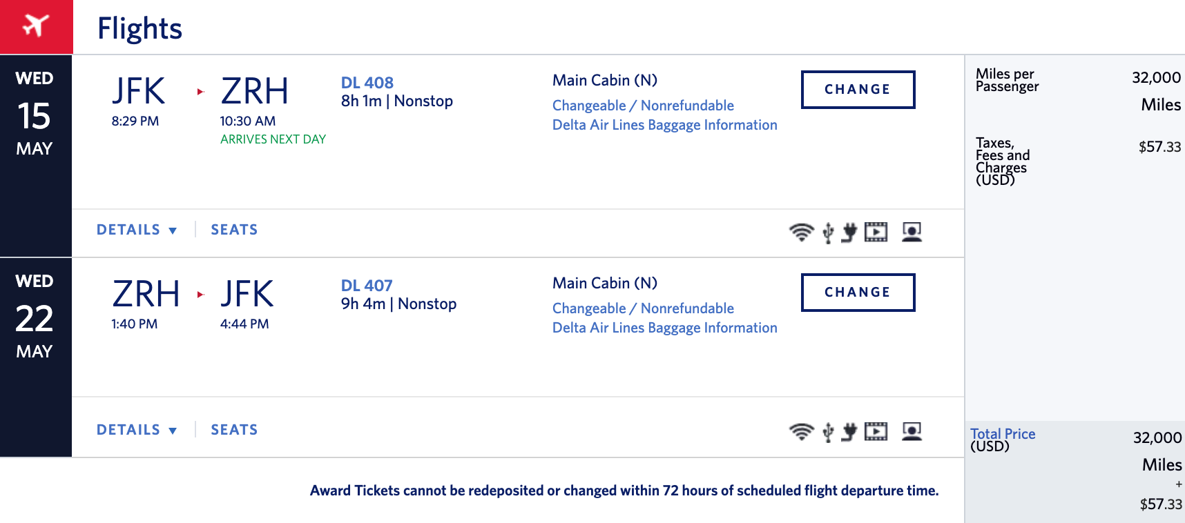 Cost: 18,000+ SkyMiles and ~$80 round-trip in economy