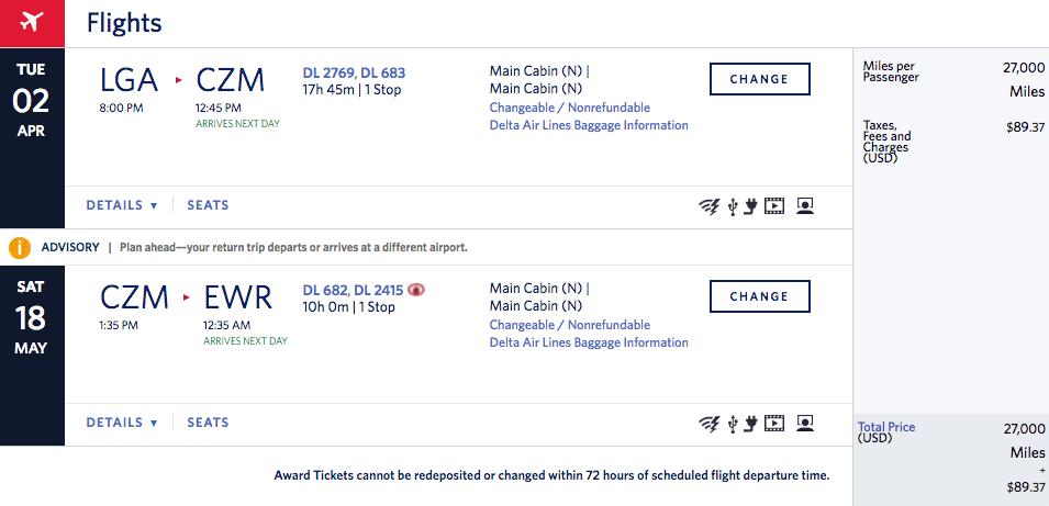 New York (LGA/EWR) to Cozumel (CZM) for 27,000 SkyMiles + $89 round-trip: