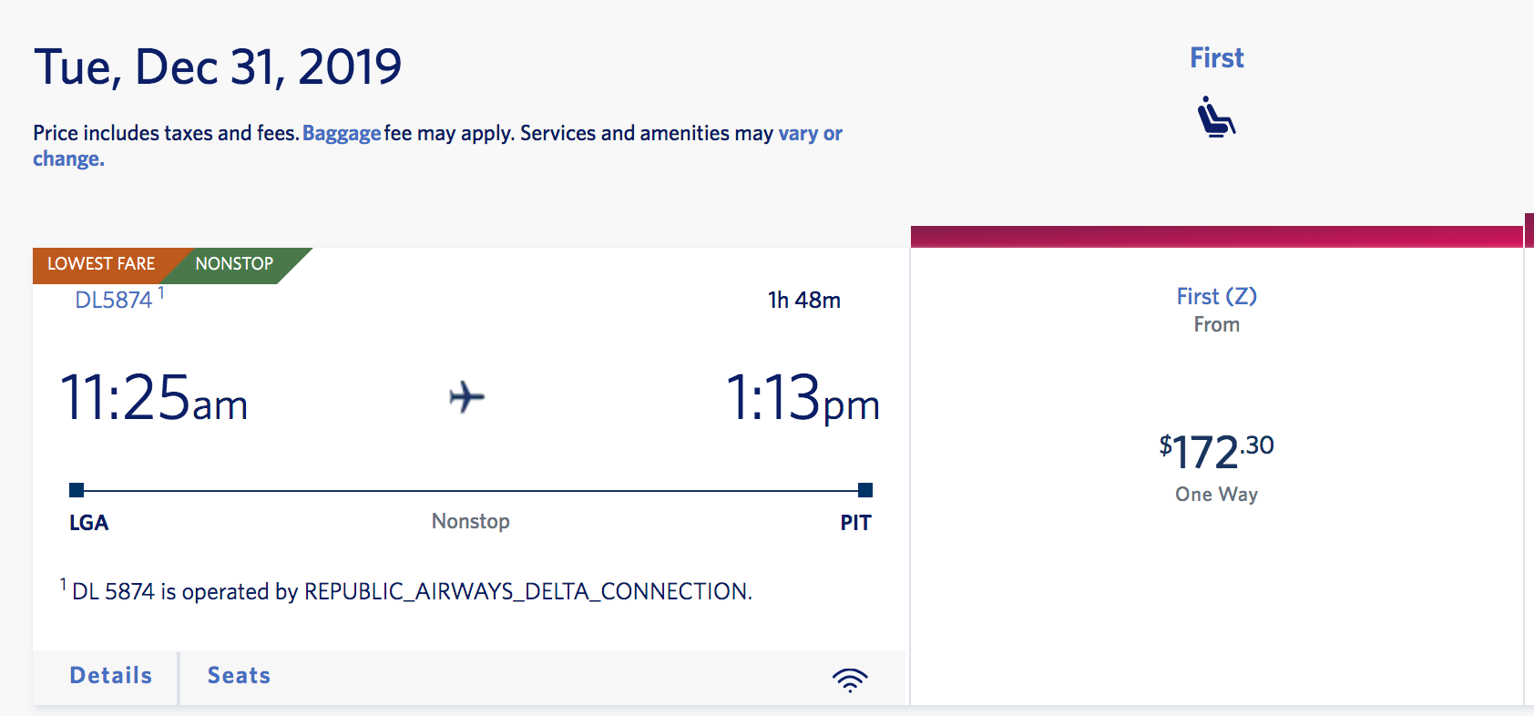 New York (LGA) to Pittsburgh (PIT) for $172 one-way: