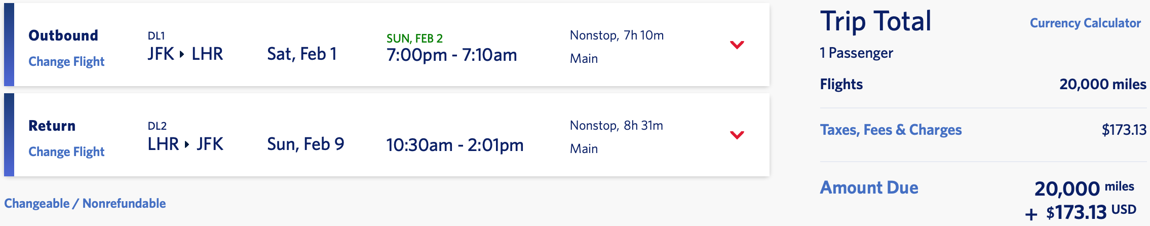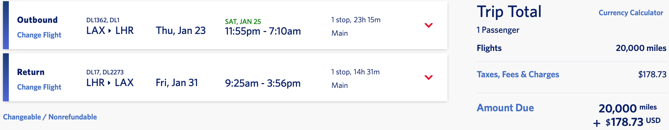Cost: 20,000+ SkyMiles round-trip in Main Cabin (economy) plus $178 in taxes and fees