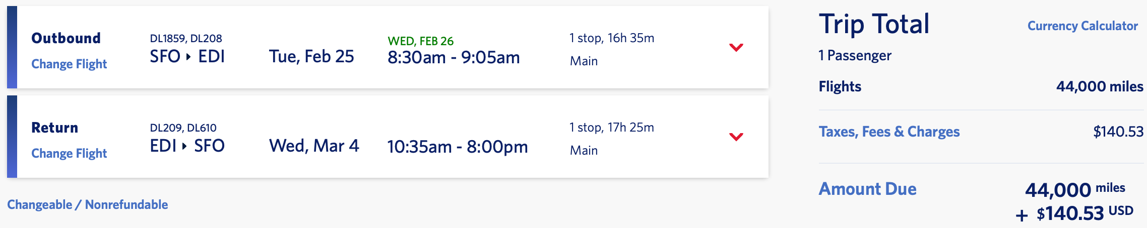 San Francisco (SFO) to Edinburgh (EDI) 44,000 miles + $141 in taxes and fees round-trip in economy: