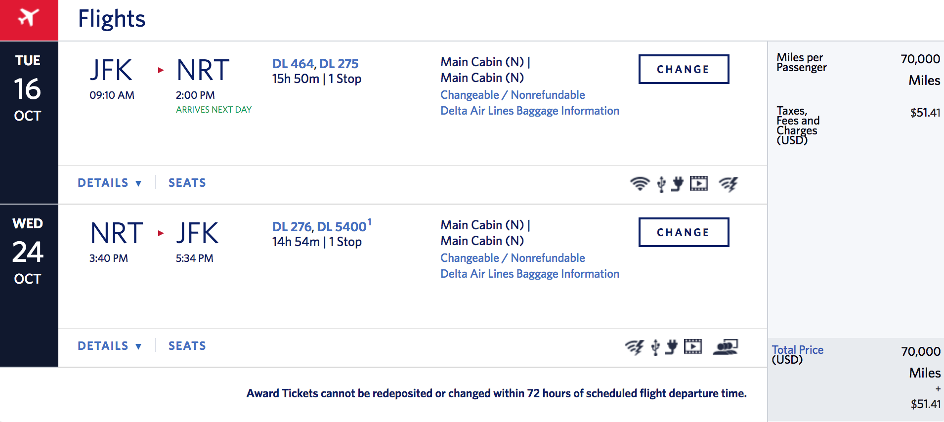 New York (JFK) to Tokyo Narita (NRT) for 70,000 miles + $51 in taxes and fees round-trip: